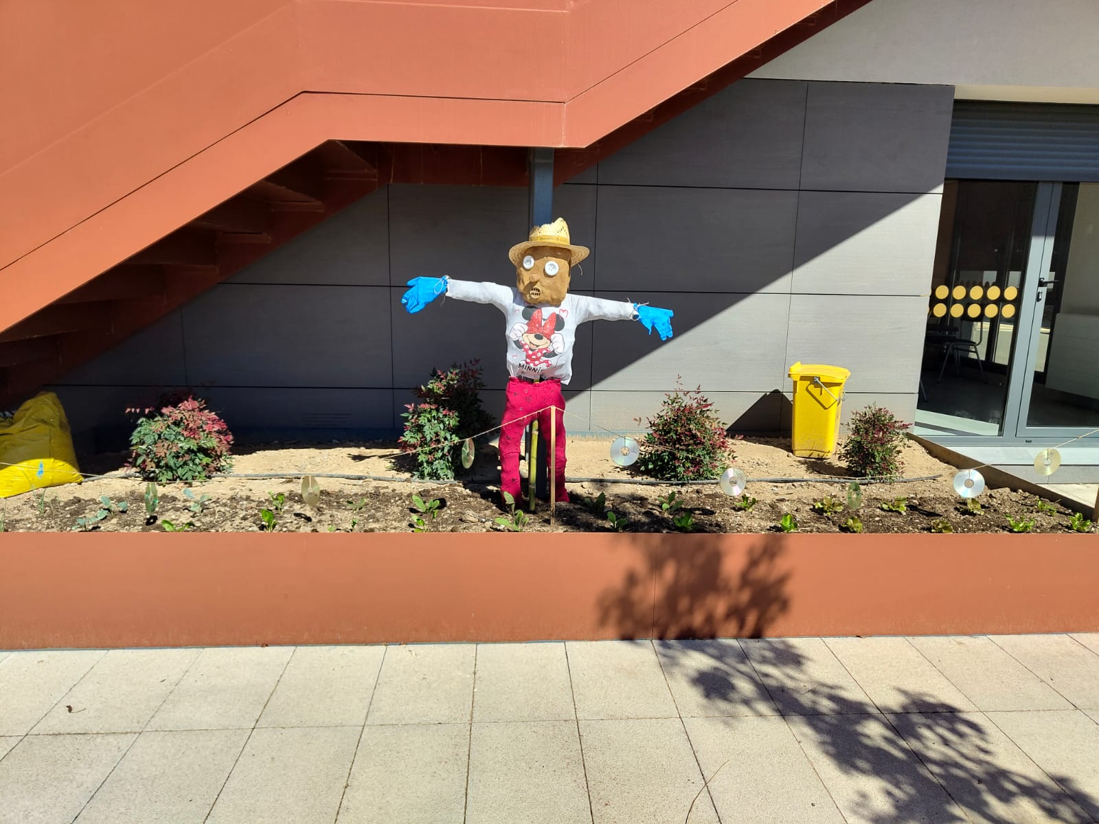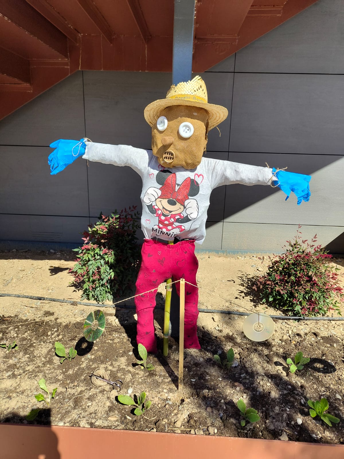 Pero eso no es todo: para proteger su huerta, han construido un espantapájaros muy especial, que han rellenado entre todos con bolas de papel y decorado con mucho cariño. ¡Ha quedado precioso!